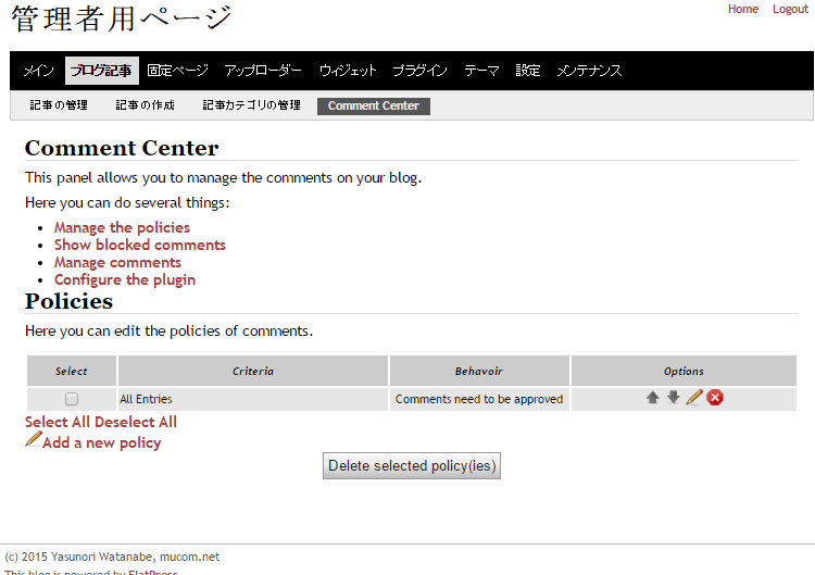 FlatPressの管理用ページから「ブログ記事」→「Comment Center」を開きます。