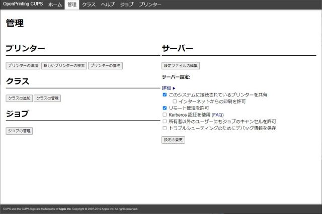 Windowsからのプリントアウトがメインなので、Sambaでプリンタ共有を行いましたが、CAPSの設定でIPP(Internet Printer Protcol)共有する設定をしていました。(無意識。。。)